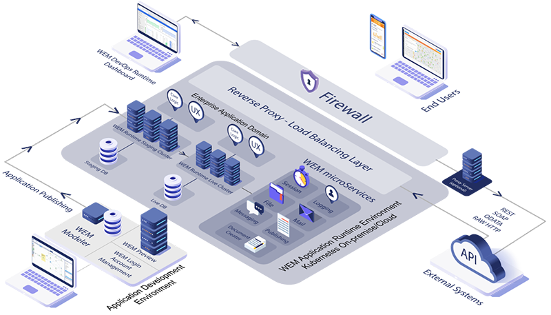 WEM은소프트웨어개발의 복잡성을 단순화하고 User 중심의시각적으로 Application을 만들 수 있도록 설계되었습니다.이를 Rapid Application Modeling 이라고 합니다.
